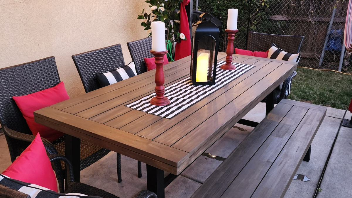 We chose a large dining set with chairs and a bench so everyone has a place to sit comfortably, whether it’s for a simple dinner like chicken quesadillas, homework, or just hanging out outside as a family.